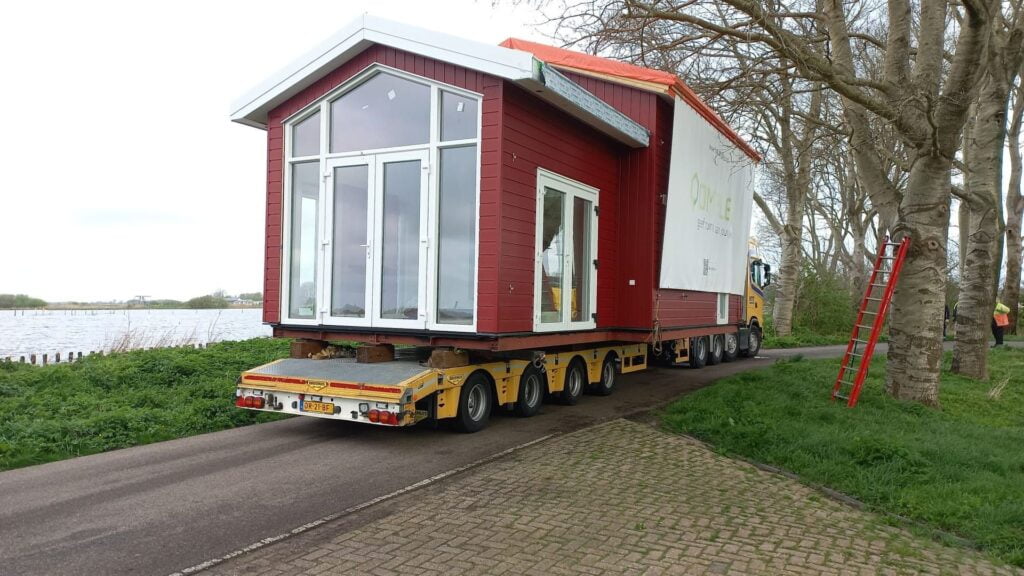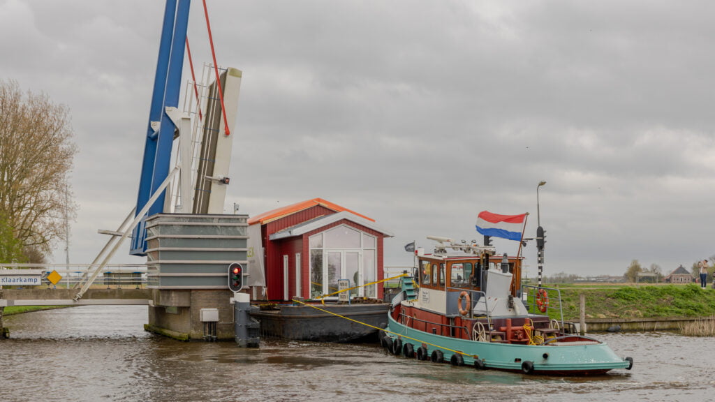 Waar onze woningen normaliter per vrachtwagen naar locatie worden vervoerd lag het bij deze Tiny House nét even anders. Bij het plannen van de route liepen we al snel tegen een probleem aan. De woning van ruim vijf meter hoog paste via regulier wegtransport niet onder de viaducten door. Op een deel van de route was er sprake van onderhoud aan de wegen waardoor deze niet toegankelijk waren. Doordat deze woning hoger is dan gebruikelijk in verband met de slaapkamer op de bovenverdieping moesten we dus wel op zoek naar een alternatief, namelijk per boot.
